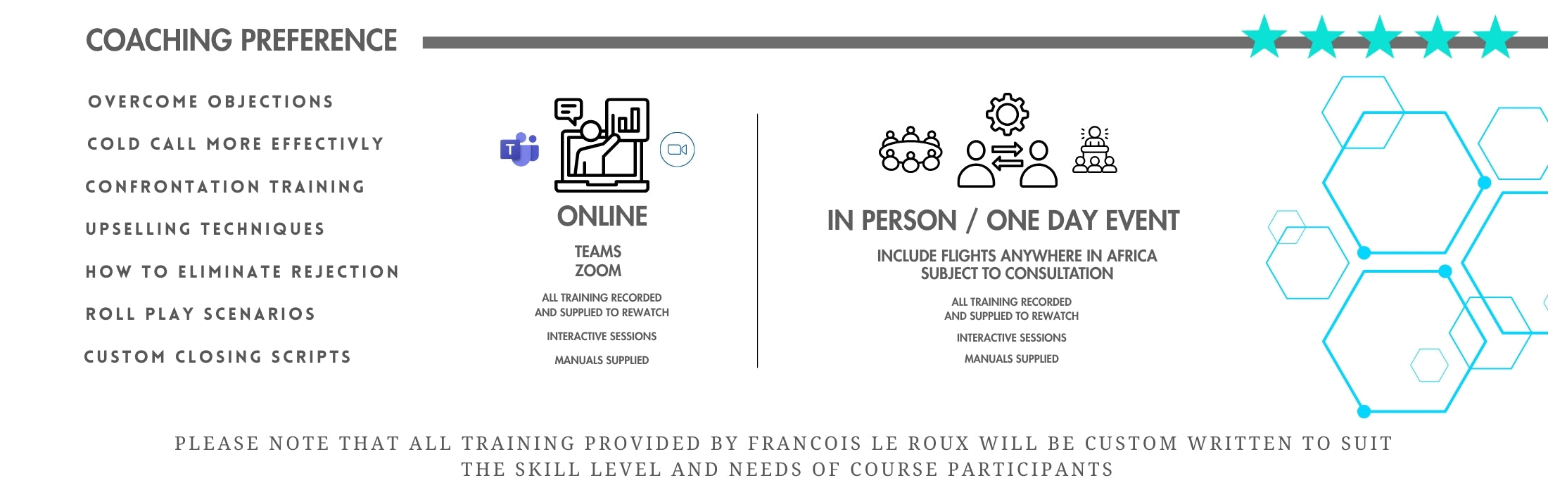 - Training Location Options: Depending on your preference, training can take place at your offices, at Francois le Roux’s offices, or virtually via Zoom.
